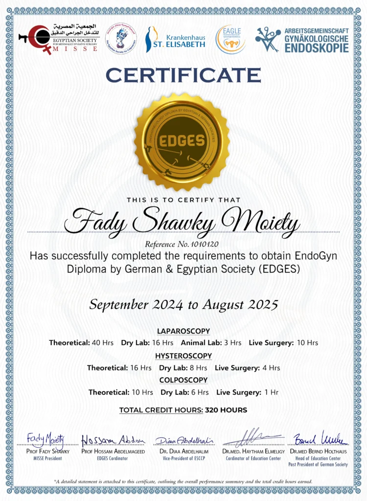 This is to certify that Dr. Fady Mohamed Shawky Mohamed Moiety has successfully fulfilled all the requirements and has been awarded the EndoGyn Diploma by the German & Egyptian Society (EDGES) in recognition of his/her achievement in May 2025.