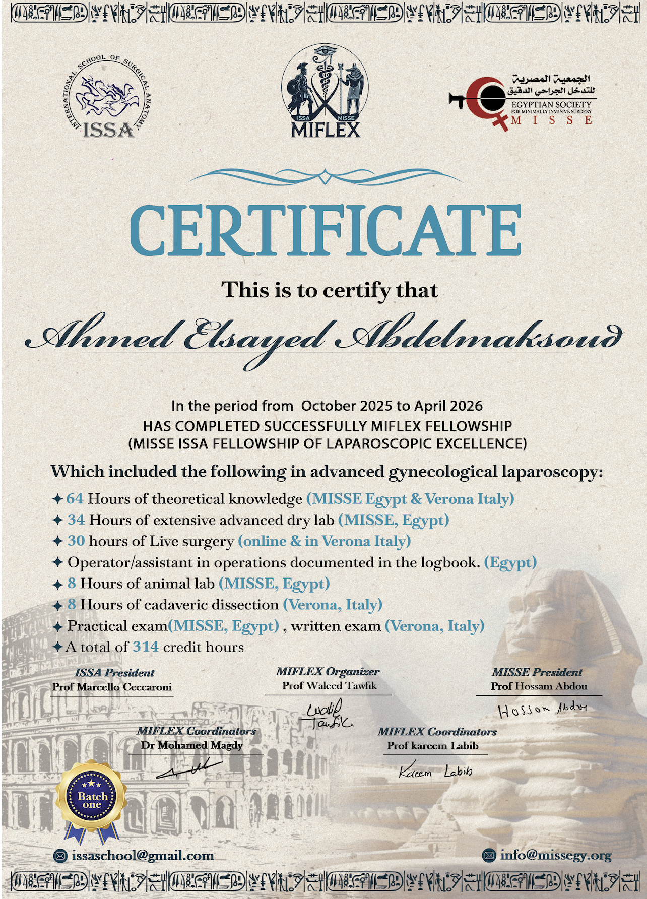 This is to certify that Dr. Ahmed Elsayed Abdelmaksoud AAmer has successfully fulfilled all the requirements and has been awarded the MIFLIX Fellowship ( MISSE ISSA Fellowship of laparoscopic Excellence ) in recognition of his/her achievement in April 2026.