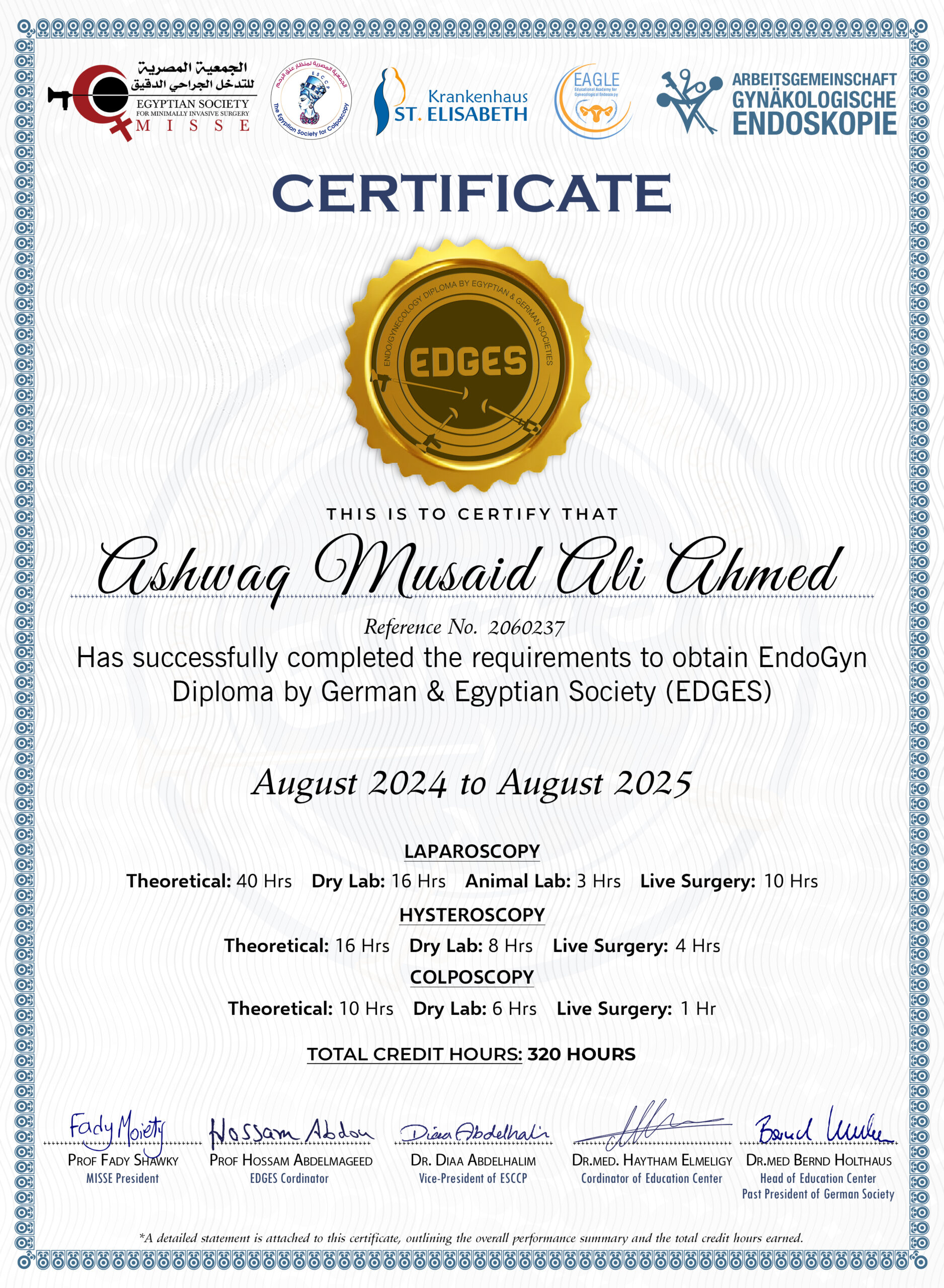 This is to certify that Dr. Ashwaq musaid ali ahmed has successfully fulfilled all the requirements and has been awarded the EndoGyn Diploma by the German & Egyptian Society (EDGES) in recognition of his/her achievement in May 2025.