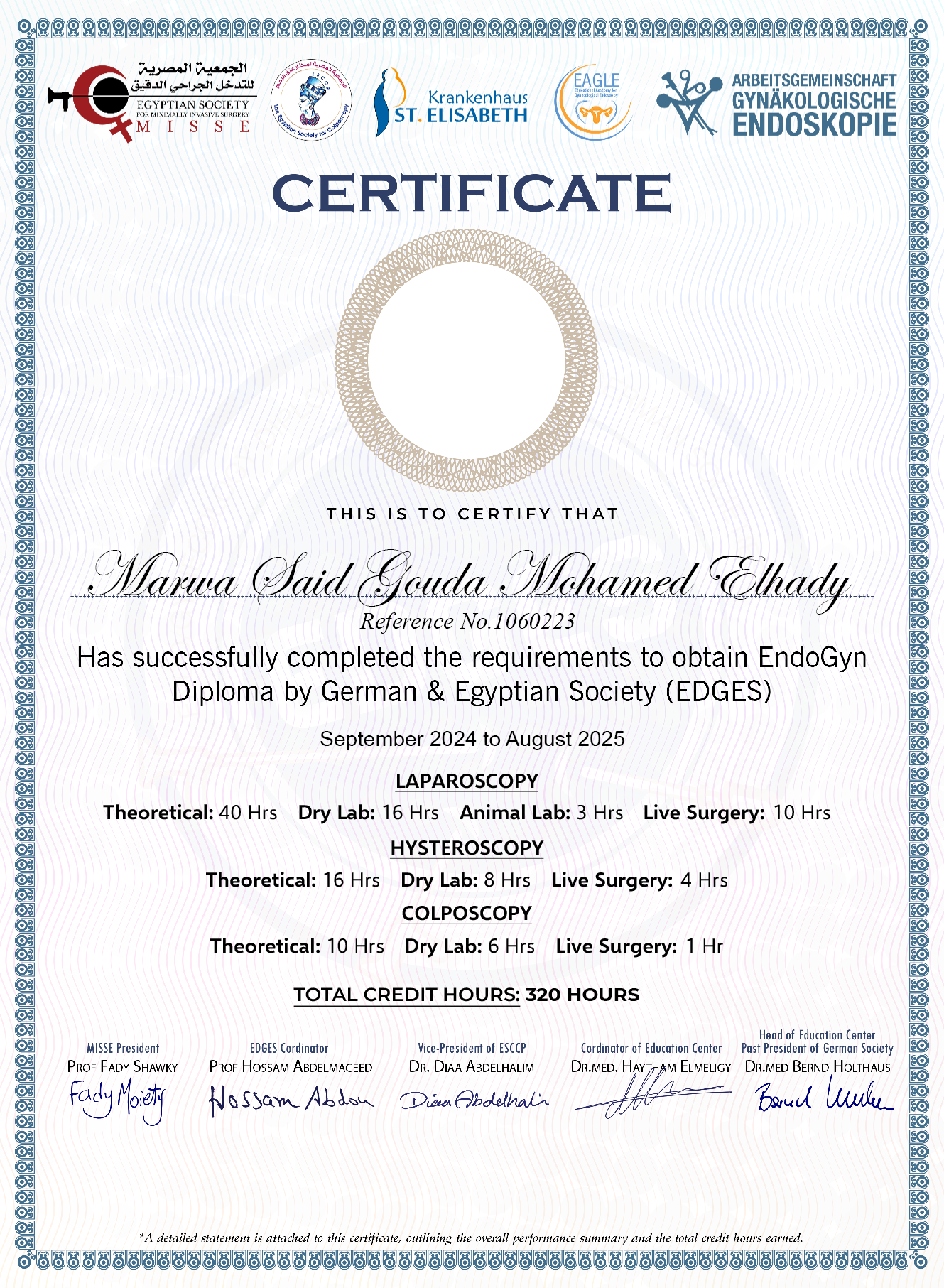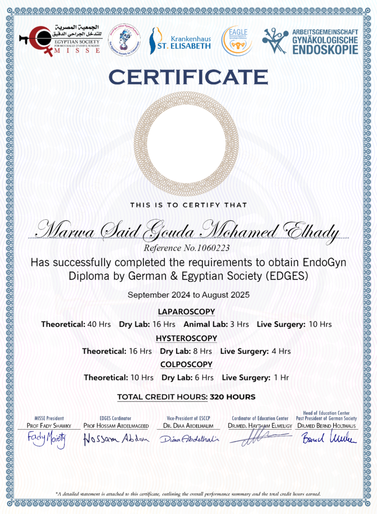 Marwa Said Gouda has successfully fulfilled all the requirements and has been awarded the EndoGyn Diploma by the German & Egyptian Society (EDGES) in recognition of his/her achievement in August 2025.